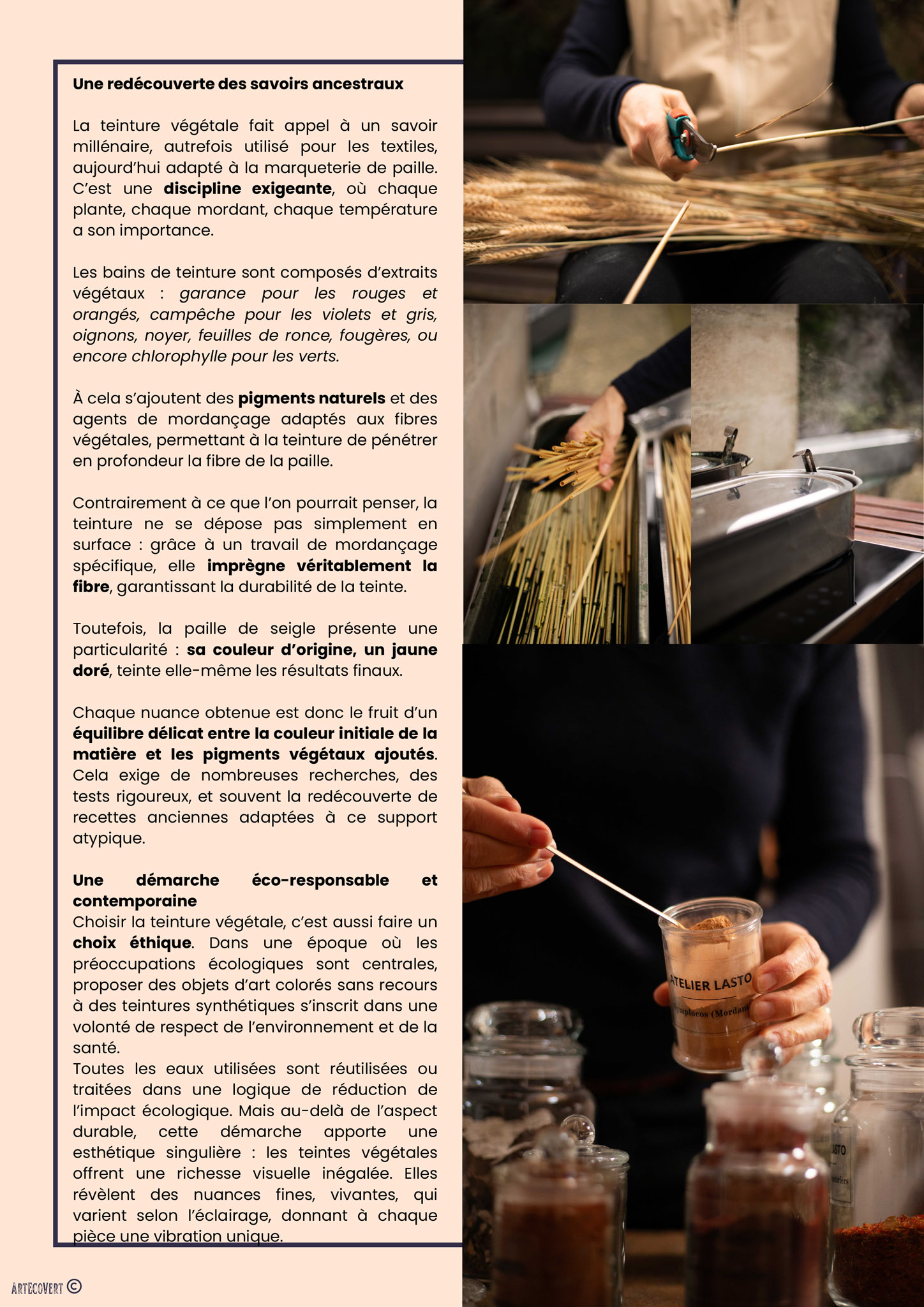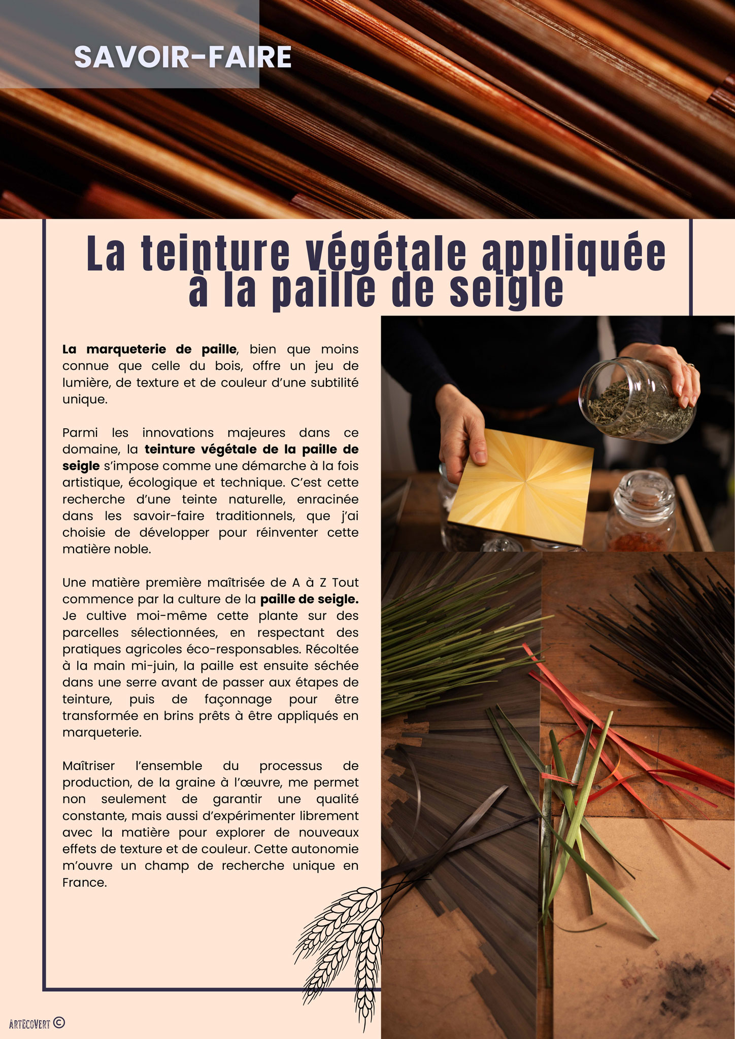 Parmi les innovations majeures dans ce domaine, la teinture végétale de la paille de seigle. Elle s’impose comme une démarche à la fois artistique, écologique et technique. C’est cette recherche d’une teinte naturelle, enracinée dans les savoir-faire traditionnels, que j’ai choisie de développer pour réinventer cette matière noble.